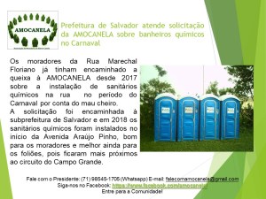 Prefeitura de Salvador atende solicitação da AMOCANELA sobre banheiros químicos no Carnaval Publicado em 8 de março de 2018 por amocanela