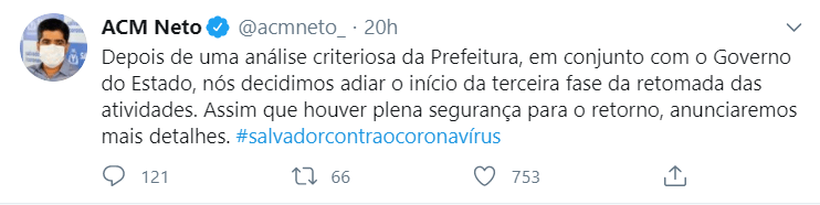 No entanto, ontem, 20, o Prefeito ACM Neto anunciou o adiamento da 3ª fase de reabertura que incluiria parques de diversões e parques temáticos; teatros, cinemas e demais casas de espetáculos; clubes sociais, recreativos e esportivos; centros de eventos e convenções.