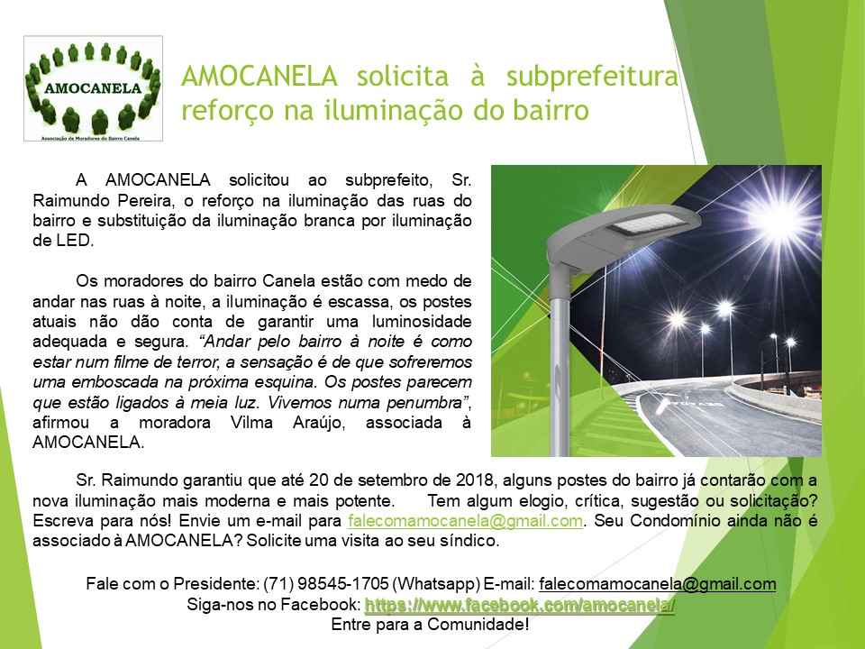 Vale dizer que, desde 2018, a AMOCANELA solicita através da Subprefeitura a instalação de iluminação de LED em todas as ruas do bairro Canela. No entanto, até hoje poucas ruas receberam tal iluminação.