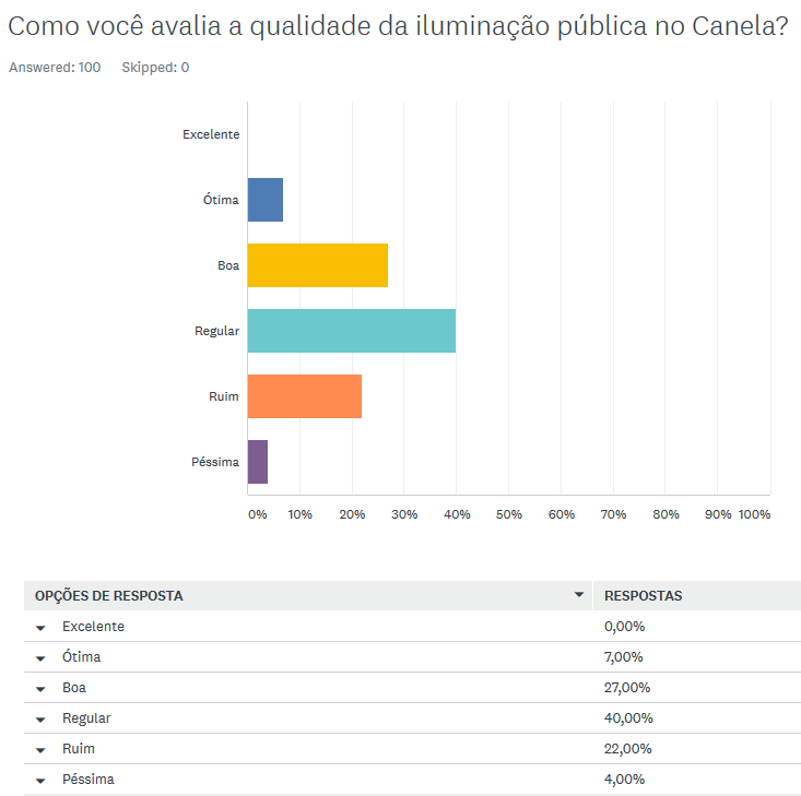 Na parte do questionário dedicada aos comentários livres, os respondentes disseram que a iluminação pública do bairro Canela “Poderia ser melhor”, “Luzes escuras e pontos estratégicos sem iluminação“, “Nem todas as ruas têm uma boa iluminação“, “Muito escuro“, “Acho que a iluminação é muito fraca“, “A maioria das ruas são escuras mesmo com iluminação pública. Poderia trocar por lâmpadas led com maior capacidade de iluminação“.