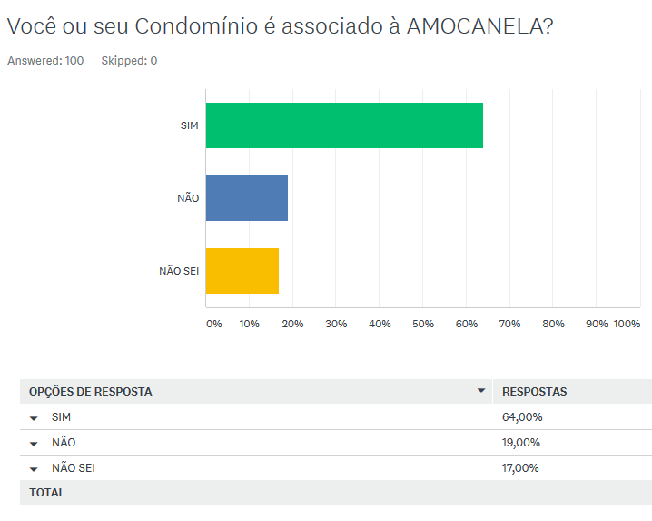 Além disso, é importante destacar que 64% dos respondentes residem em condomínios associados à AMOCANELA, contra 19% que residem em condomínios que não são associados e 17% que não souberam responder.