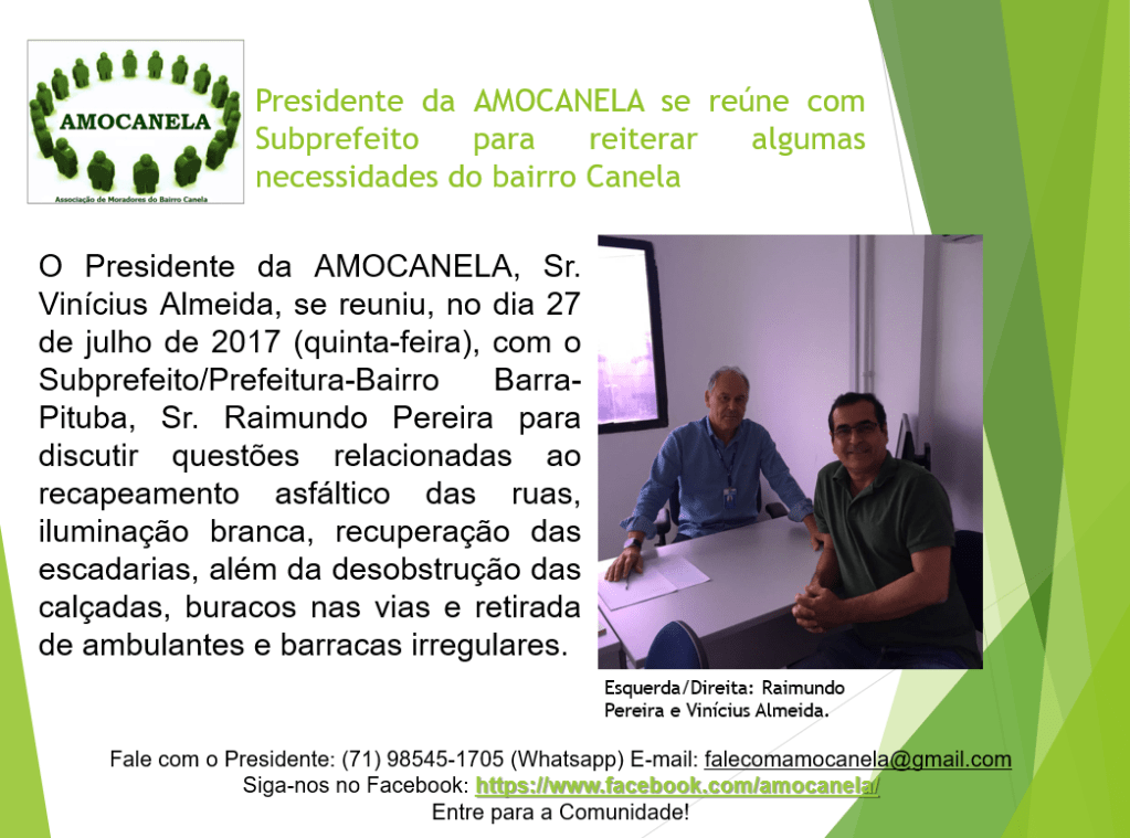 Vale dizer que, em 2017/2018 foi realizado o recapeamento asfáltico da Rua Padre Feijó e parte da Avenida Araújo Pinho, uma pleito antigo da AMOCANELA.