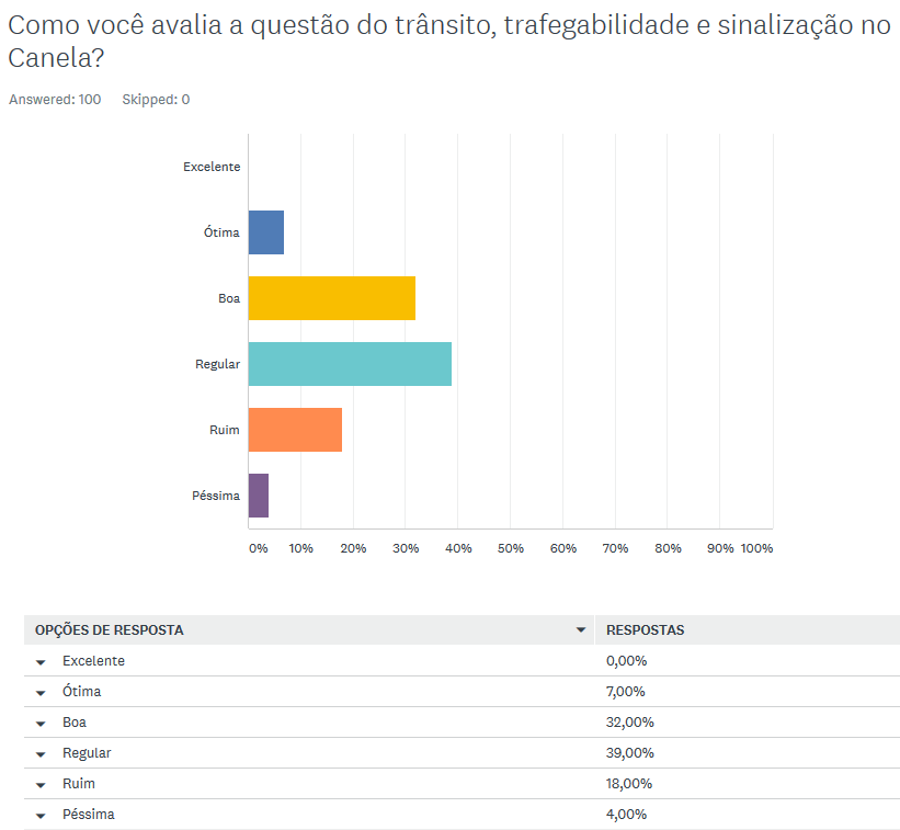 Temos então que 7% dos respondentes avaliam a questão do trânsito, trafegabilidade e sinalizado no bairro como ótima, 32% boa, 39% regular, 18% ruim e 4% péssima.