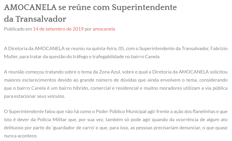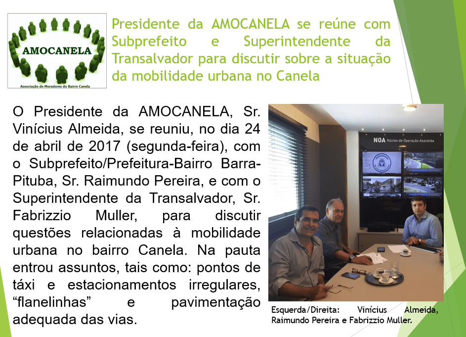 Desde 2016, o assunto é pauta da AMOCANELA, em 2017 e 2019 a Diretoria se reuniu com o Superintendente da Transalvador, Fabrizzio Muller, e com os subprefeitos, Raimundo Pereira e Fábio da Mata e absolutamente nenhuma iniciativa foi tirada do papel.