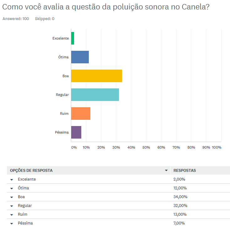 Temos então que 2% dos respondentes consideram a questão da poluição sonora no bairro excelente, 12% ótima, 34% boa, 32% regular, 13% ruim e 7% péssima.