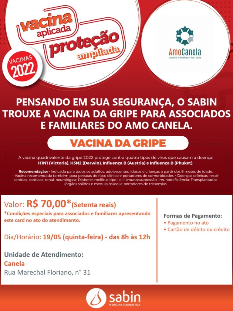 A AMOCanela firmou uma parceria com o Laboratório SABIN para oferecer a vacina QUADRIVALENTE da gripe 2022 aos moradores do bairro com um desconto exclusivo.