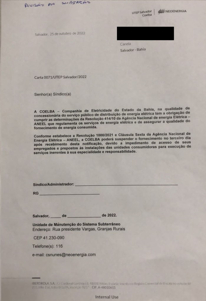 O porteiro entrou em contato com a síndica que não autorizou a entrada e imediatamente ligou para a COELBA a fim de confirmar a informação. Na concessionária, a informaram que não havia nenhum serviço em aberto vinculado ao CNPJ do Condomínio.
