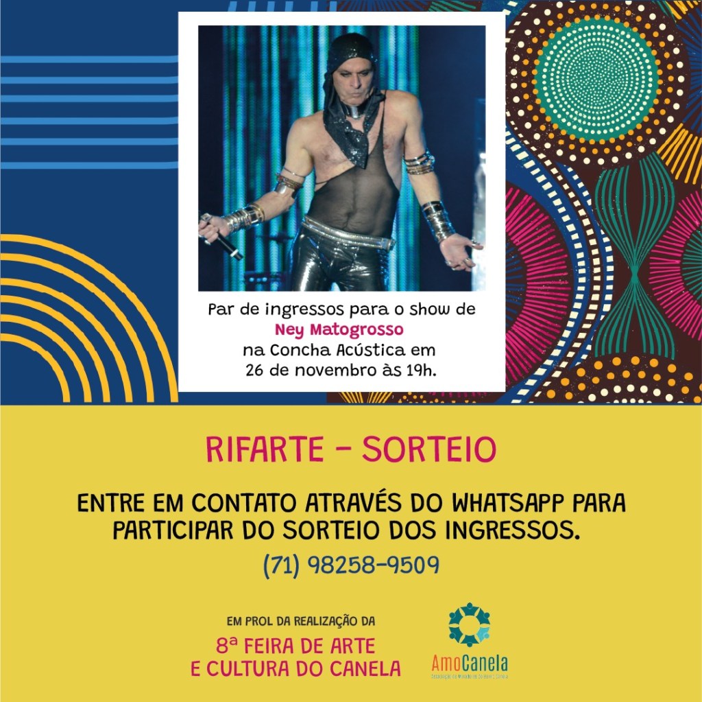 Para ajudar na realização do nosso evento lançamos a nossa Rifarte que este ano está sorteando um par de ingressos para o show da lenda Ney Matogrosso. Será um show inesquecível e você ganhar ainda poderá levar um acompanhante.