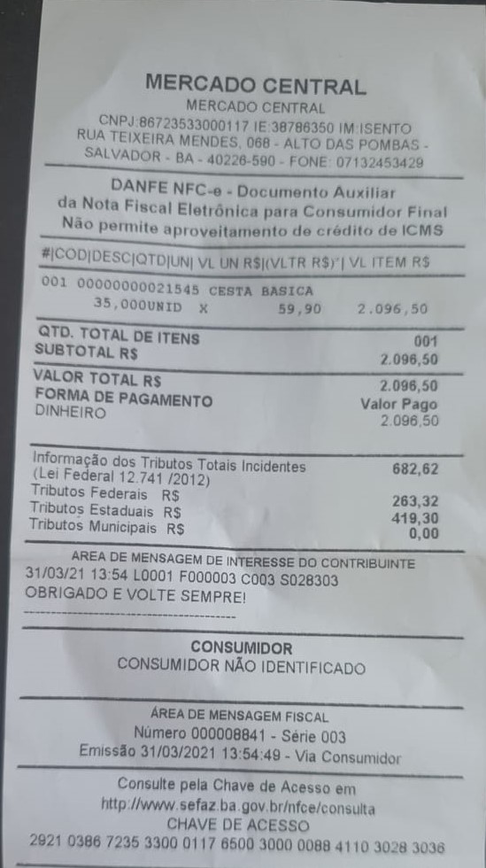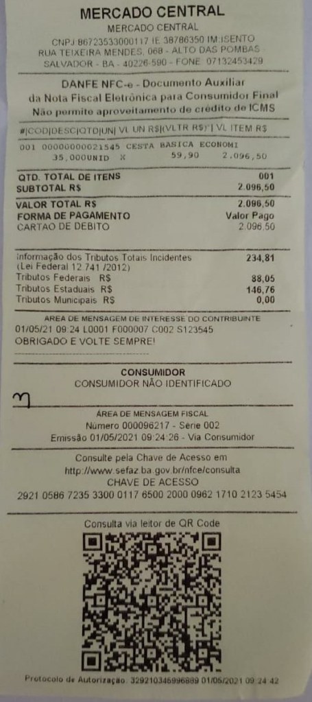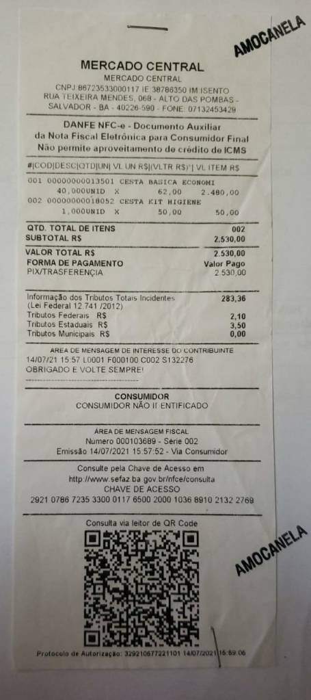 * 1und açúcar 1und arroz 1und farinha 1und feijão 1und café 1und óleo de soja1und cuscuz 1und cream cracker 1und biscoito doce1und extrato sachet 1und leite em pó É bom 1und macarrão 500g 1und goiabada 250g 1und papel higiênico 1und sabonete 1und pasta de dente 1und sabao em pó bem-te-vi 200g 1und detergente liq. 1und água sanitária 1und refresco Marata Total: 20itens